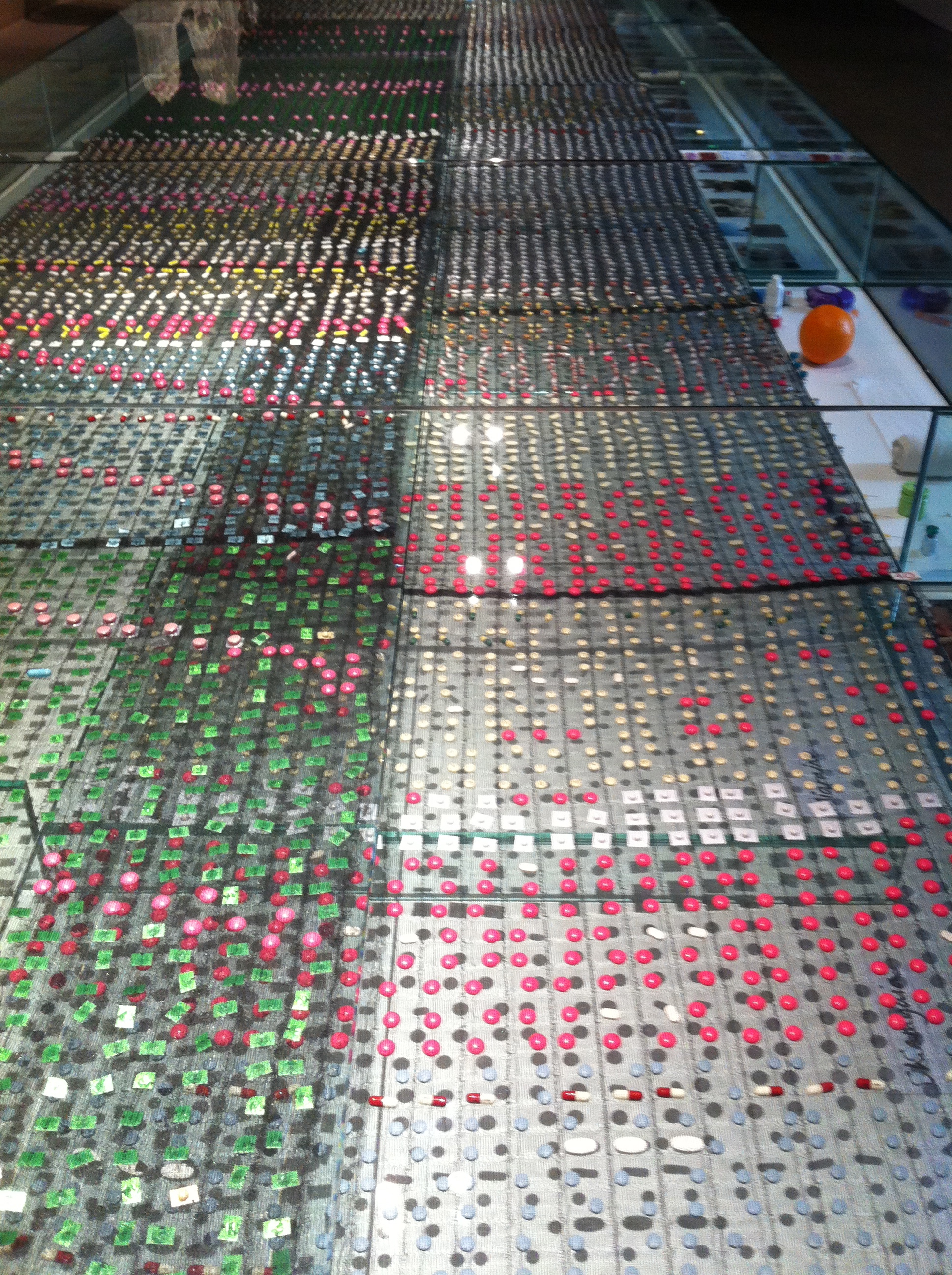 In the next gallery, a vast glass-covered table holds a collection of 14,000 pills. Pharmacopoeia’s Cradle to Grave II is the outcome of a study into the use of medicines by the average Dutch person, but is bordered by photographs and objects from daily lives. If these are the “normal” relatively healthy people, what does this vast intake of powerful medication imply for how we understand our own wellness?