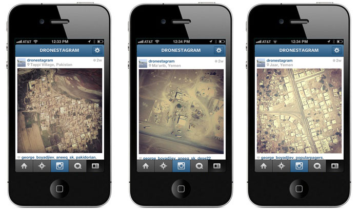 Meanwhile, Honor Harger’s Drone’s Eye View: a Look at How Artists Are Revealing the Killing Fields, whose venue Lighthouse in Brighton hosted the Paglen show, introduces James Bridle’s significant body of work on drone warfare. Bridle’s Drone Shadow is an ongoing investigation into the shadow of the drone, in which one-to-one representations of the MQ-1 Predator Unmanned Aerial Vehicle (UAV) are drawn to scale on urban landscapes, while his new project Dronestagram, launched this month, is a social media project on Twitter, Instagram and Tumblr which posts a drone’s-eye-view of strike locations.