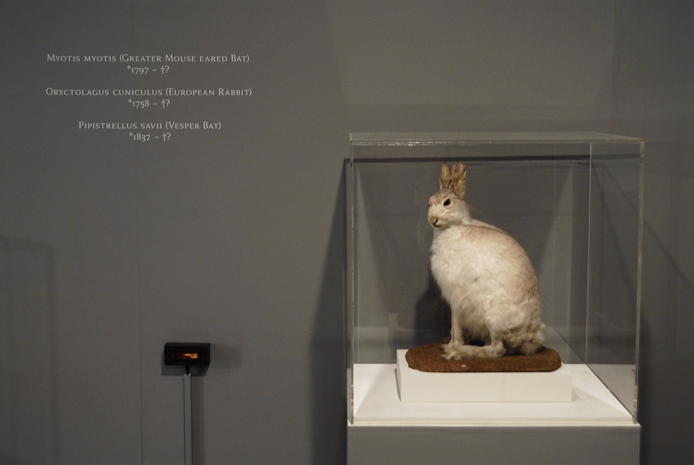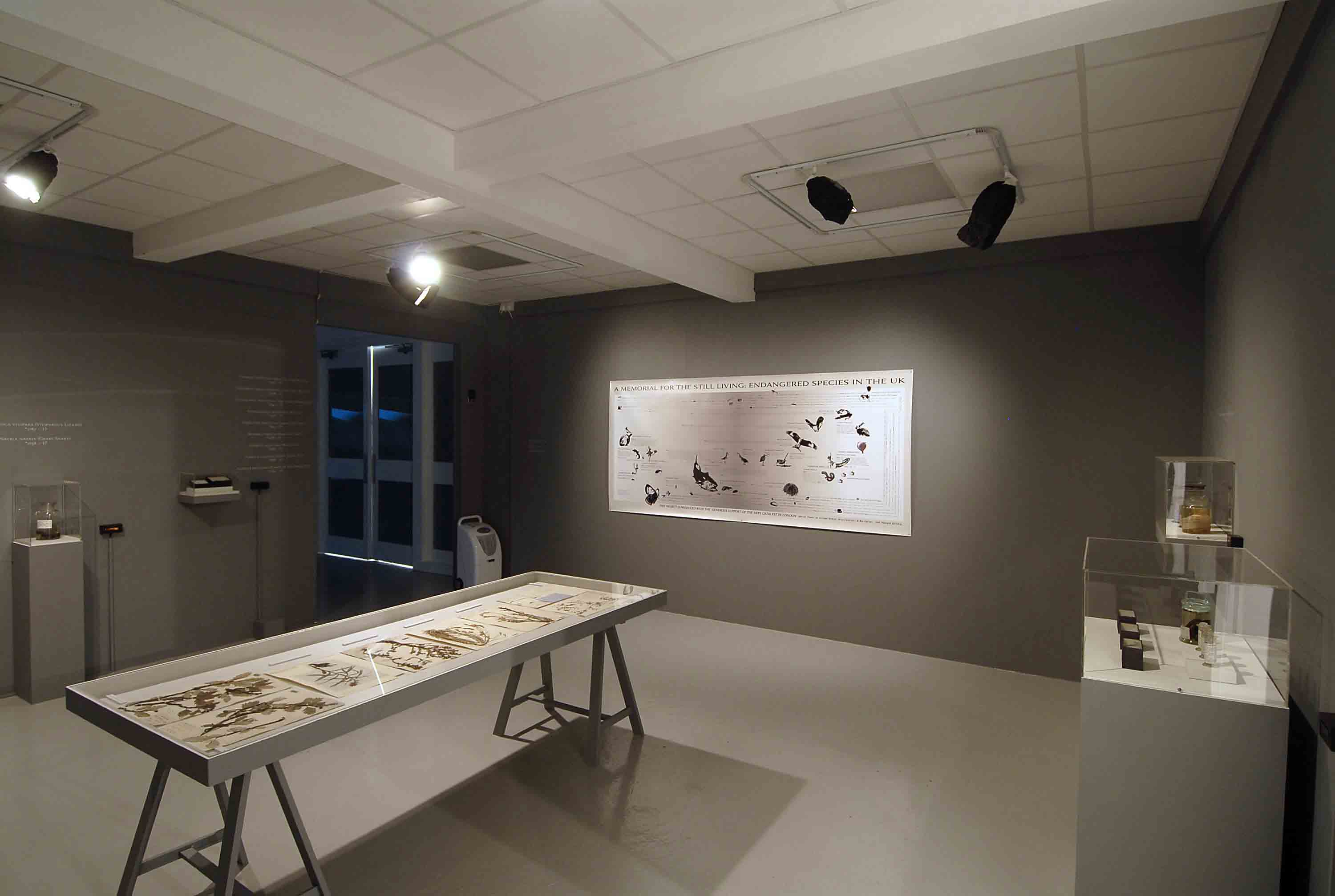 Beatriz’s project for Dark Places, A Memorial for the Still Living explored the ‘dark places’ of zoological science and presented a sombre reflection on endangered species of the British Isles. Produced remotely, with Beatriz sending detailed lists of species and specifications, the artwork manifested as a striking art installation which confronted visitors with the reality of British species threatened with extinction. Continuing the artist’s investigation into interspecies, her interest was to confront visitors with the only mode of encounter left once a species has become extinct: the description, image, sound or taxidermed shell of a once thriving organism. However, rather than focusing on already extinct species, her focus was on the ‘still living’; species classified as being under threat, but which still stand a chance for survival if immediate action is taken. Beatriz posited that, after they have been eradicated from our planet as a result of hunting, loss of habitat or climate change, our only opportunities for interaction with these species will be with bottled and mounted specimens. The possibility of an encounter ‘in the flesh’ will have disappeared, with humans reduced to studying preserved examples of each species.