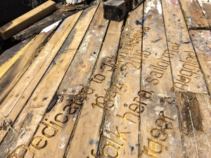 This summer, with planning permission granted from Southend Council and Natural England for its siting and installation, the Graveyard to Lost Species was sailed back onto Leigh Marshes to become part of the local landscape. With the names of many lost species carved into the boat’s hull, decks and interior, the artwork is visible to the public from the shore, and publicly accessible by foot at low tide, so that visitors can read the text on and inside the boat. It will gradually decay over many years back into the mud.