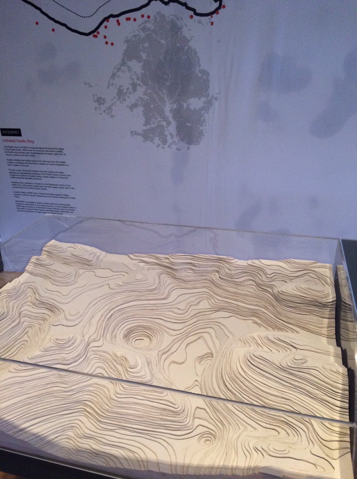 Ahmed initiated The Inter-Pacific Ring Tribunal (INTERPRT), a collective commission of inquiry, whose long-term goal is to support legal processes taken by people of the Pacific Rim against environmental destruction by corporations and governments, by gathering spatial evidence and hosting a series of alternative tribunals to debate and test “ecocide” (the deliberate destruction of the natural environment) as a viable legal instrument. In the research exhibition for Conflict Minerals, INTERPRT presents visually powerful spatial evidence – maps, animation, drawings, models, and archival material – gathered over three years on the case of ecocide in West Papua, a militarised territory, the site of a long-term conflict between Indonesia and Papuans seeking self-determination. Central to the conflict is the Grasberg mine, which contains the planet’s largest combined reserve of copper and gold. Since the late 1970s, Freeport, the transnational company that operates the mine, has been dumping as much as 200,000 tonnes of mine waste, known as tailings, every day directly into the Aikwa delta. The practice has devastated the environment, turning thousands of hectares of forest and mangroves into wasteland. The company has controversial security arrangements with the Indonesian military, which commits severe human rights violations and suppresses political free speech. International journalists, humanitarian workers, and researchers face restricted movement in the region, requiring remote methods of visualising and reporting on the conflict.