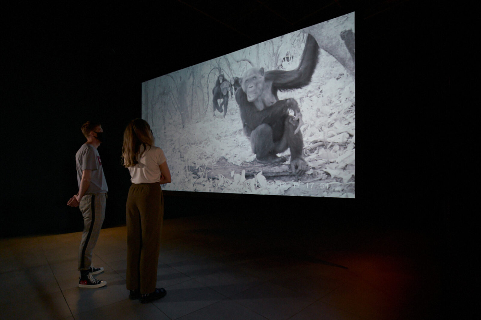 In Pan troglodytes ellioti and cousins (2016), the visitor encounters a life-sized video projection of a family of chimpanzees in a Nigerian forest, caught when they triggered a night-vision camera during the day. The chimps’ gentle and curious acceptance of this device contrasts with the viewer’s uneasy realisation – on leaving the gallery – that they too have triggered a camera and been recorded.